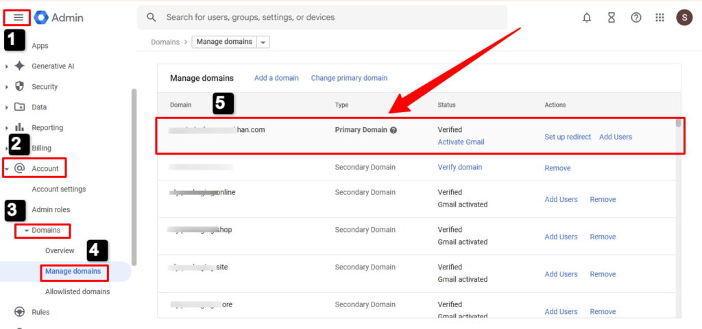 Your primary domain is the first one you register when signing up. Every account has exactly one. This is your “home base”—all admin settings, billing, and organizational units tie back to it.