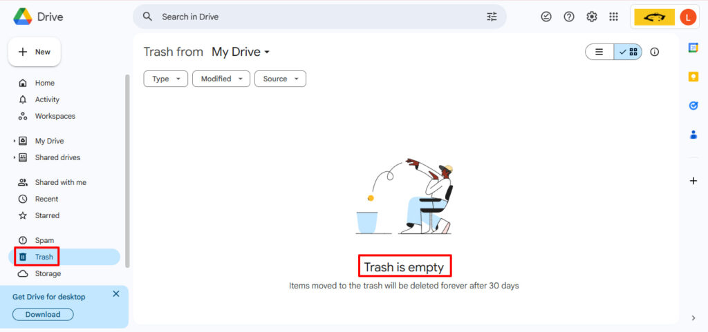 - Click “Trash” in Drive’s left sidebar