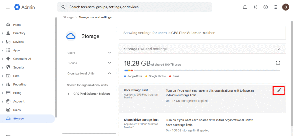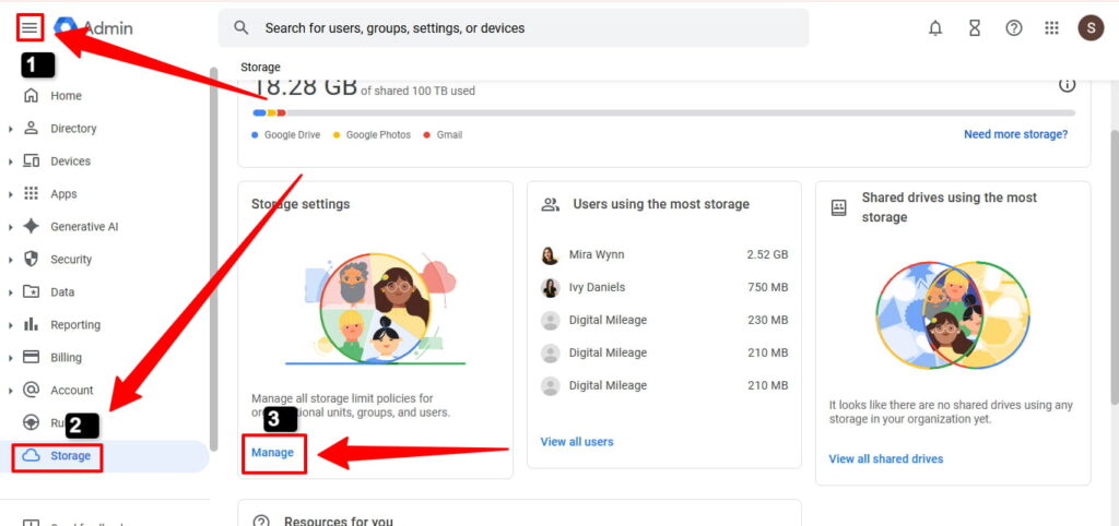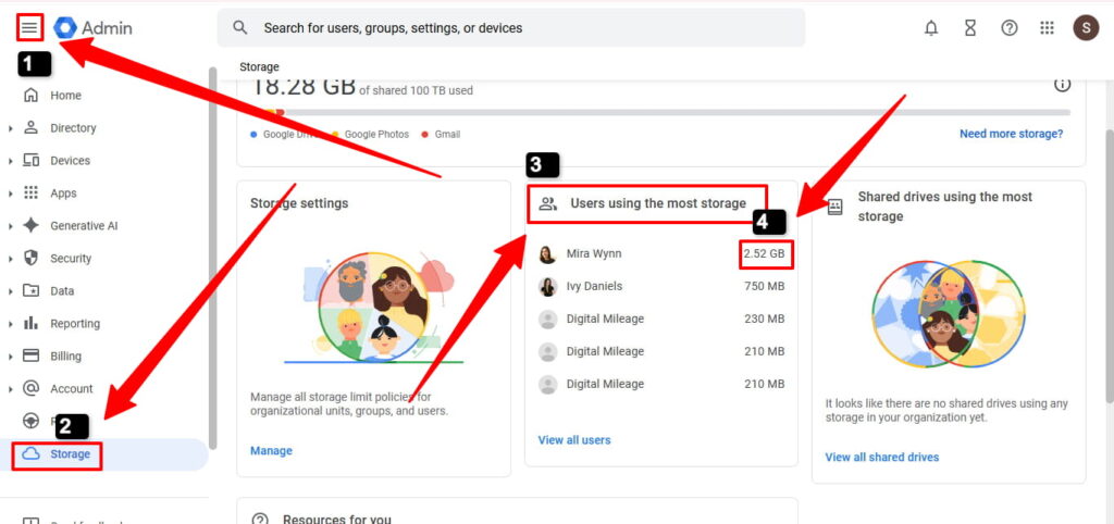 Sign in to admin.google.com. Go to Reports → Storage. Learn more about managing your Admin Console.