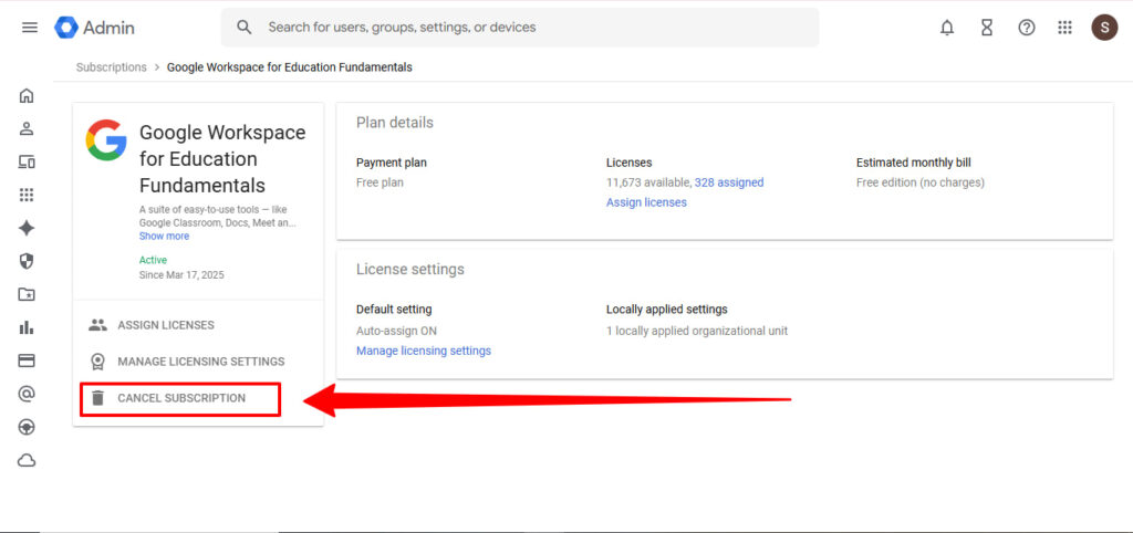 Go to your Admin Console, click Billing > Subscriptions, select your active plan, and choose “Cancel Subscription” to stop billing.